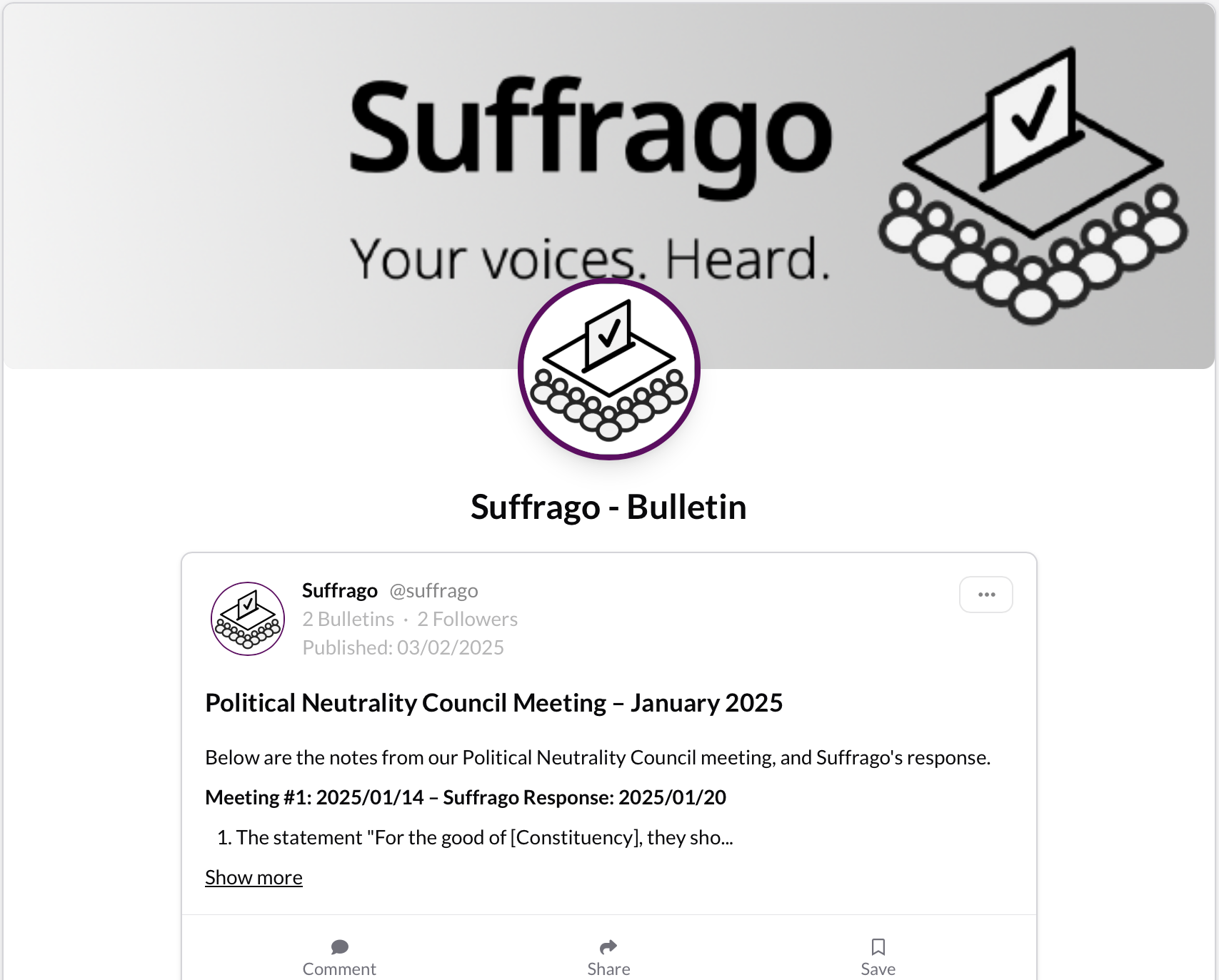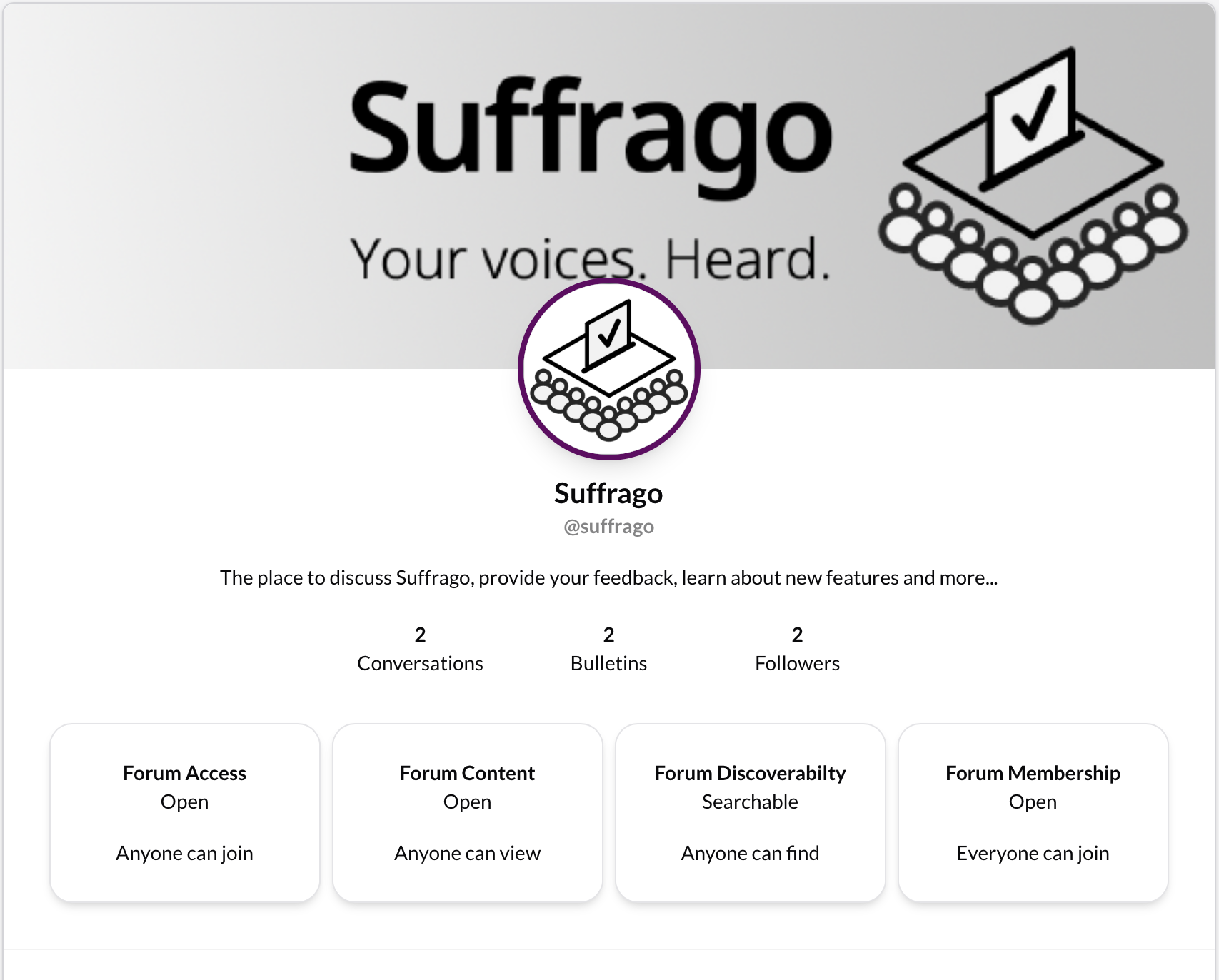 Suffrago statement on Suffrago comes from the voice of the people, with Forums you can amplify your voice by finding like minded individuals.