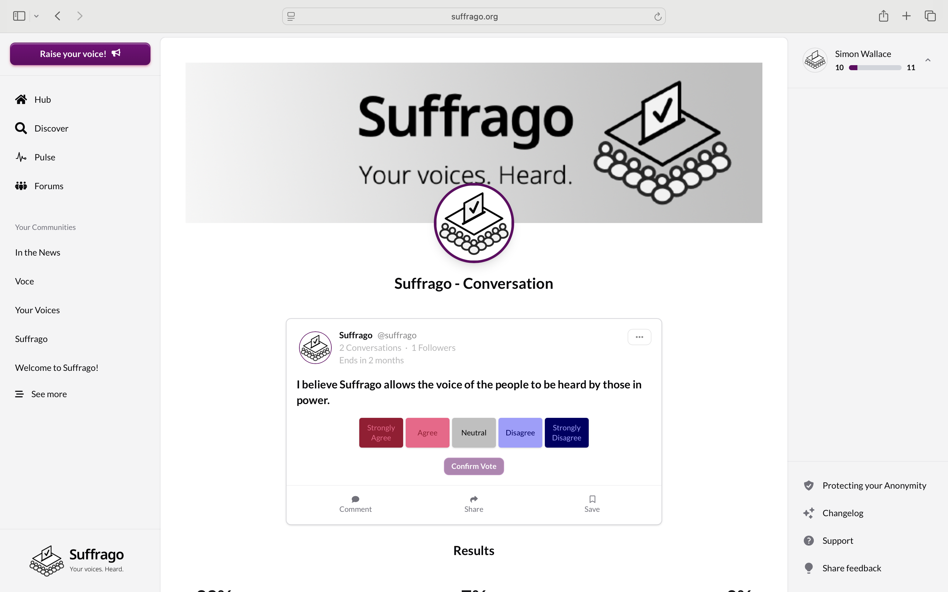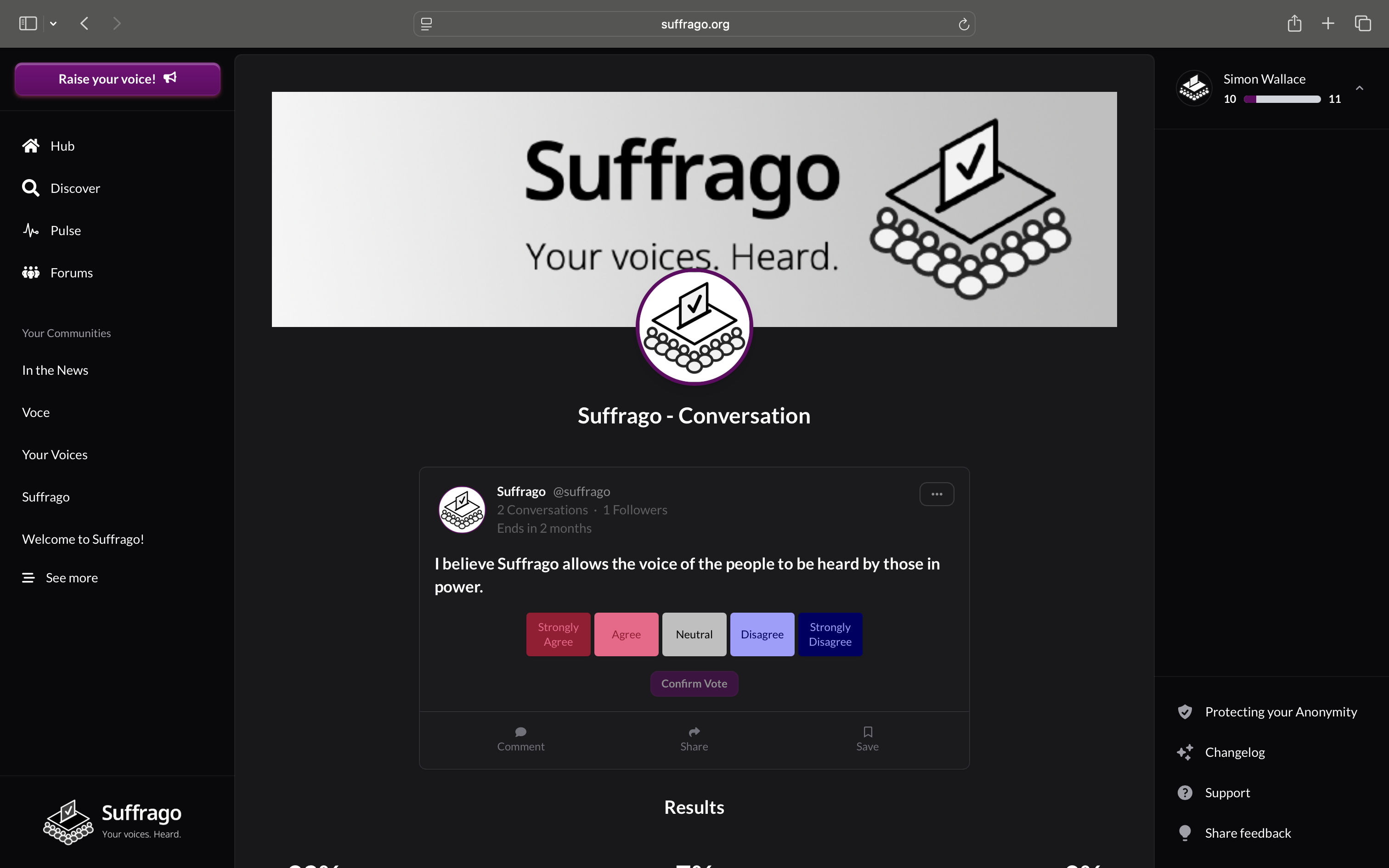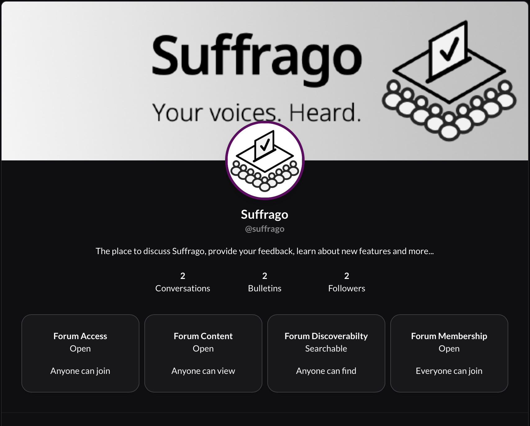 Suffrago statement on Suffrago comes from the voice of the people, with Forums you can amplify your voice by finding like minded individuals.
