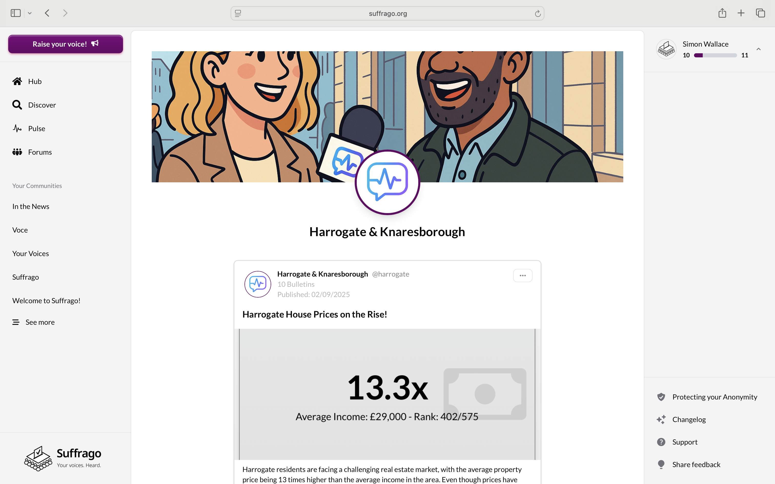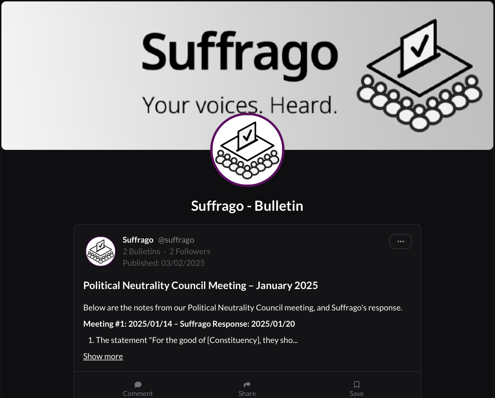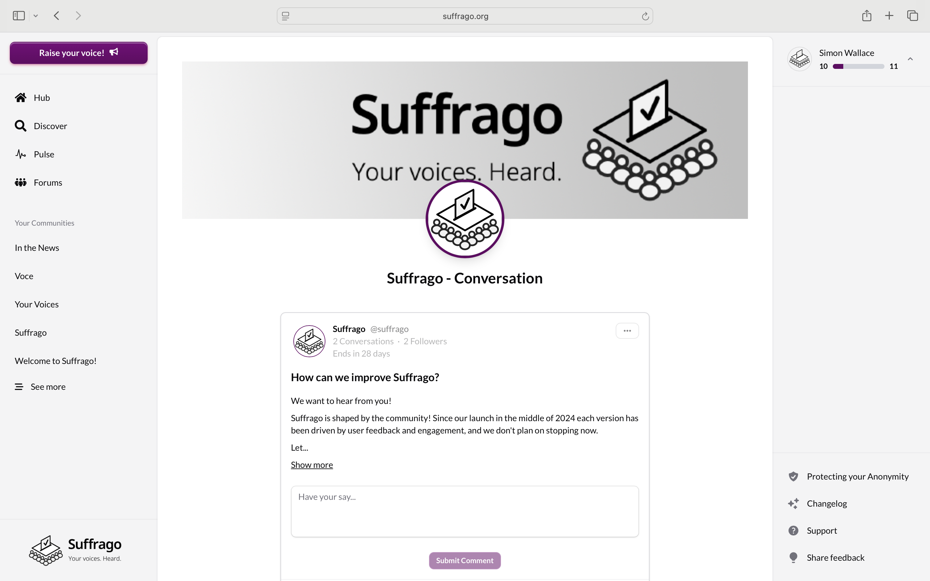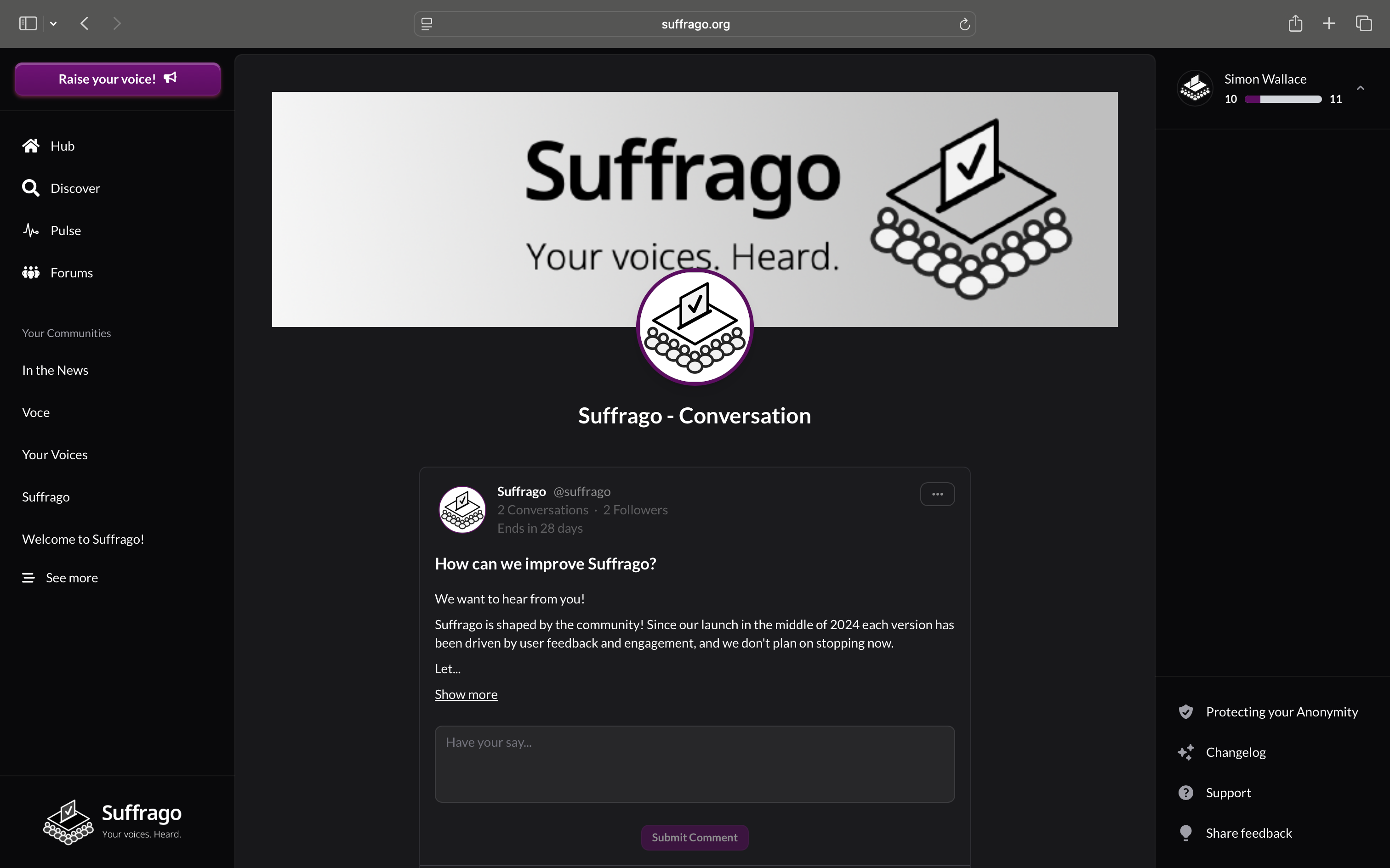 Suffrago statement on Suffrago comes from the voice of the people, with Forums you can amplify your voice by finding like minded individuals.